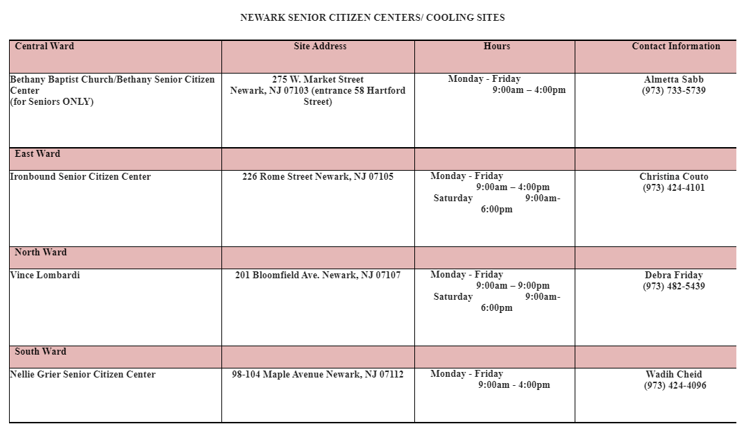 “The Health Department urges Newark residents to take precautions to prevent serious illness that can result from the heat, especially among vulnerable individuals such as seniors and those with chronic health problems or mental health conditions. Vulnerable Newark residents should use air conditioning to stay cool, drink water at regular intervals, and limit strenuous activity, especially during the hottest parts of the day.”