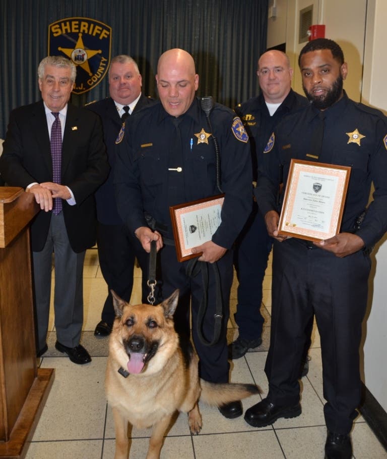 Undersheriff Kevin Ryan (2nd from left) and Lieutenant John Tully (2nd from right) were also on hand to commend the officers and their canines.