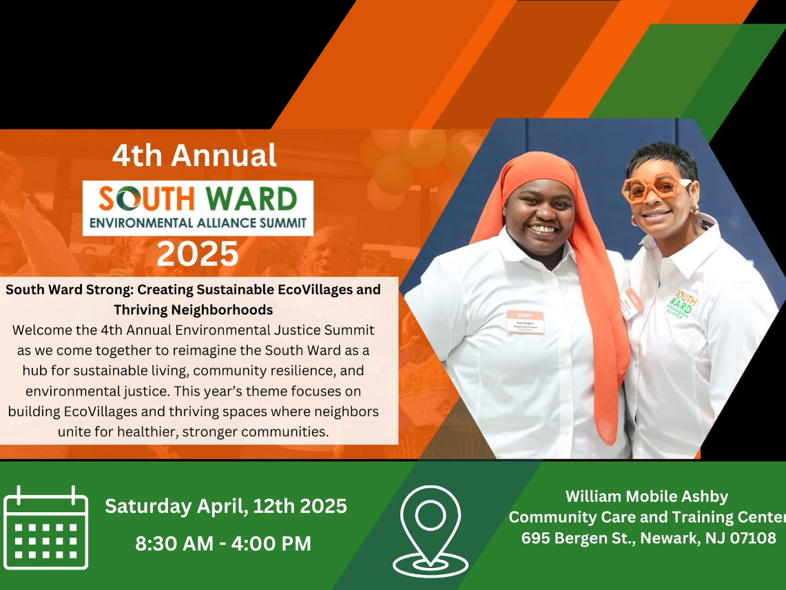 On Saturday, April 12, 2025, the South Ward Environmental Alliance (SWEA) will host its 4th Annual Environmental Justice Summit at the William Mobile Ashby Community Care and Training Center, 695 Bergen Street, Newark, NJ. This year's theme, “South Ward Strong: Creating Sustainable EcoVillages and Thriving Neighborhoods,” sets the tone for a powerful day of community-led engagement focused on shaping an equitable, resilient, and sustainable future for Newark’s South Ward.