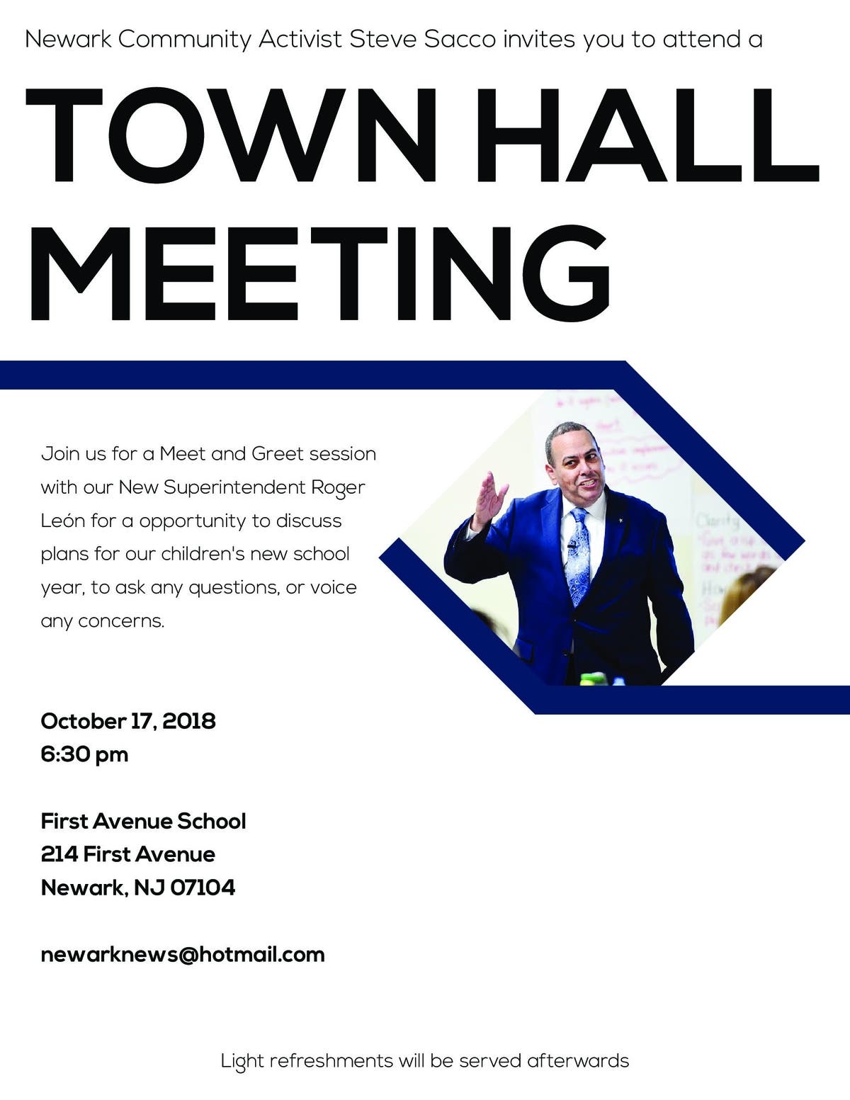 On Wednesday, Oct. 17, Newark community activist Steve Sacco will spearhead a Town Hall event featuring a “meet and greet” session with Superintendent Roger León.
