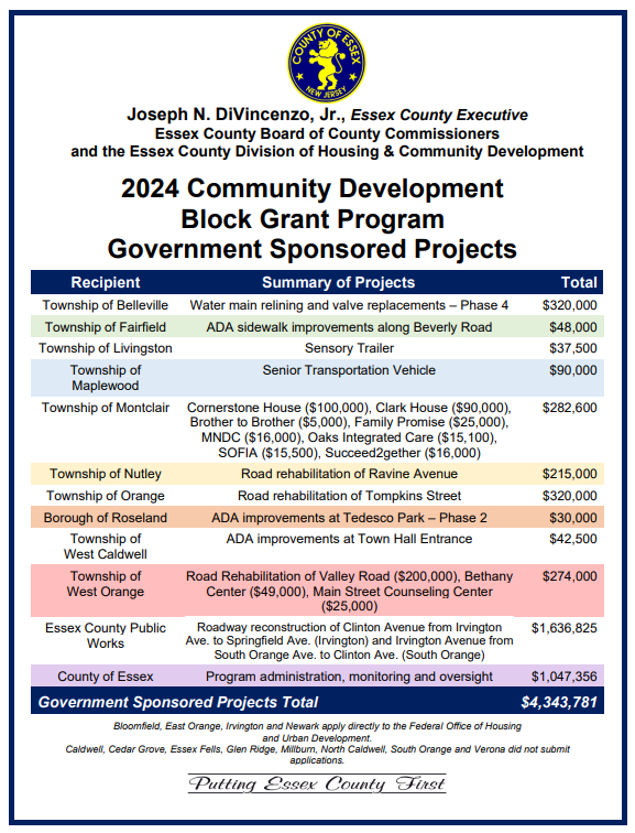 Essex County was provided with $1,047,356 for program oversight, monitoring and administration and $1,636,825 for roadway improvements to Clinton Avenue in Irvington and Irvington Avenue in South Orange.