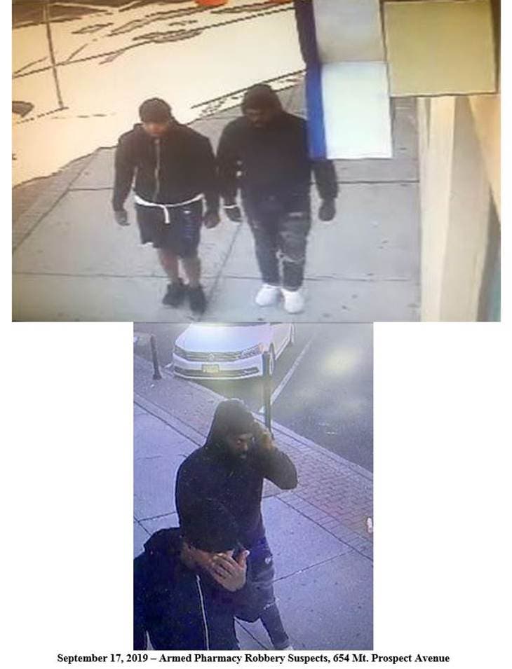 NEWARK, NJ — Newark police are searching for two men who robbed a pharmacy at gunpoint on Tuesday, making off with drugs and cash, authorities said.
