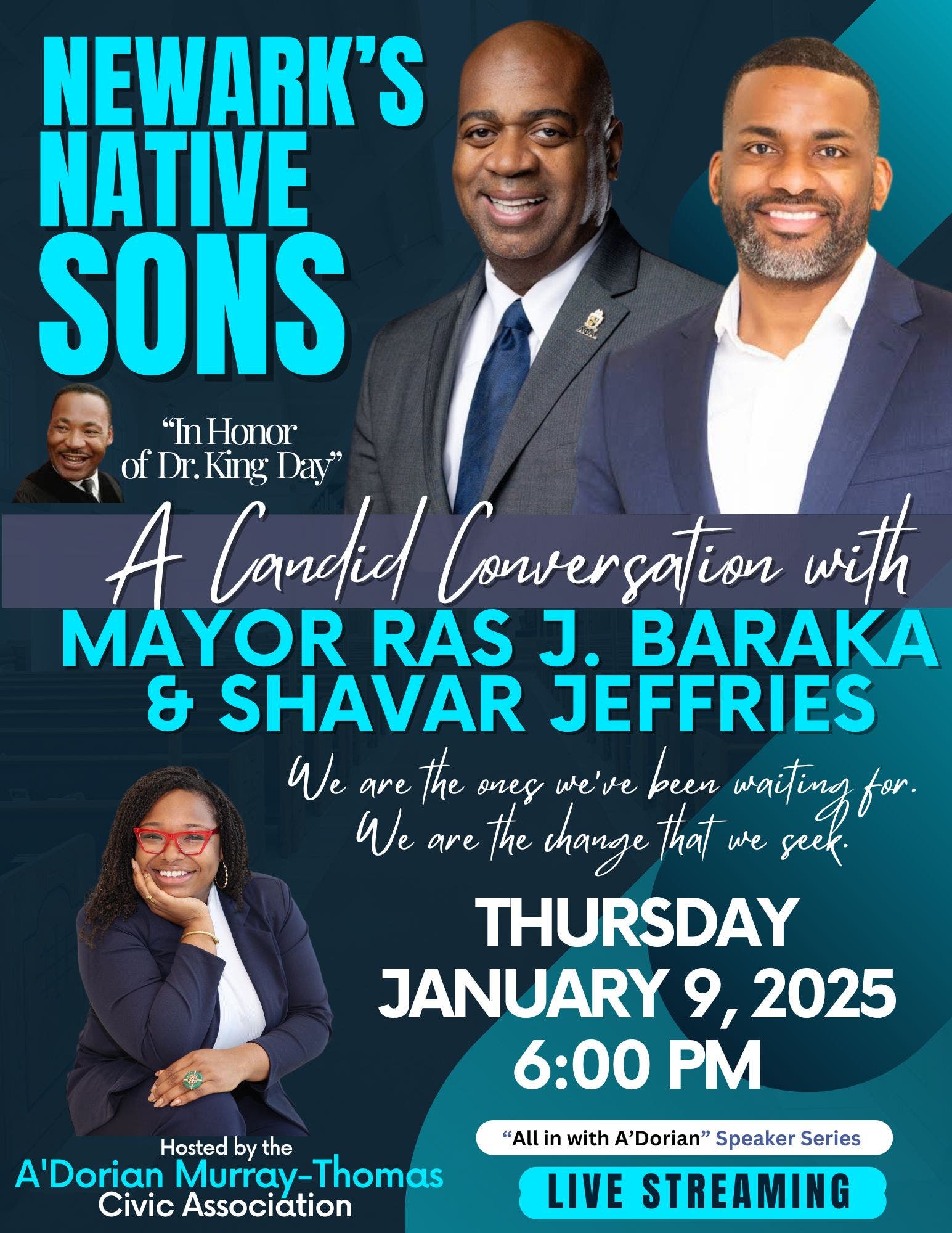 The A’Dorian Murray-Thomas Civic Association, established in August 2024, will host their inaugural event, “Newark’s Native Sons: A Candid Conversation with Mayor Ras J. Baraka and Shavar Jeffries", a 90-minute livestream conversation to discuss accomplishments and progress in Newark in light of Dr. Martin Luther King Jr.’s life on Thursday, January 9, 2025, at 6 p.m. moderated by the organization’s Founder and Principal Officer, A’Dorian Murray-Thomas.
