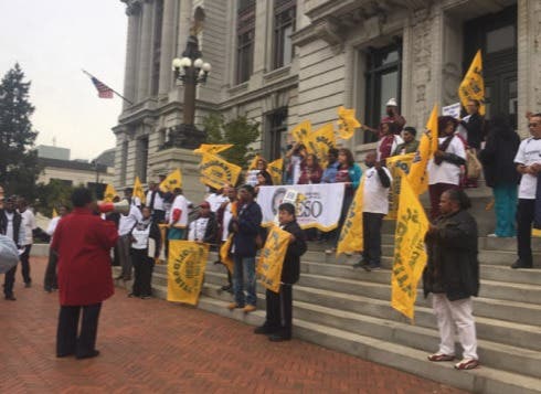 “The state has an obligation to the people of Newark,” said Councilwoman Chaneyfield Jenkins, addressing the assembled crowd of workers and supporters. “The state has been dragging its feet and threatening the livelihood of 1,400 workers at Saint Michael’s. It isn’t right. It isn’t fair.”