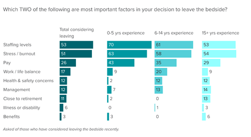 - Of those nurses currently at the bedside, 72% have considered leaving recently