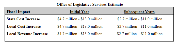 “The Office of Legislative Services estimates that this bill would lead to a $4.7 million to $13 million increase in state expenditures in the first full school year following enactment and a $2.7 million to $11 million increase in state expenditures in each subsequent year. The expenditures would first be incurred by school districts and then reimbursed by the state. The greater costs in the first year reflect the initial purchase of feminine hygiene product dispensers. Based on data from the 2020-2021 school year, under the bill, approximately 1,383 schools across the state would be required to provide free feminine hygiene products in all school bathrooms. Total enrollment of students in grades 6 through 12 in these schools approximated 724,800.”