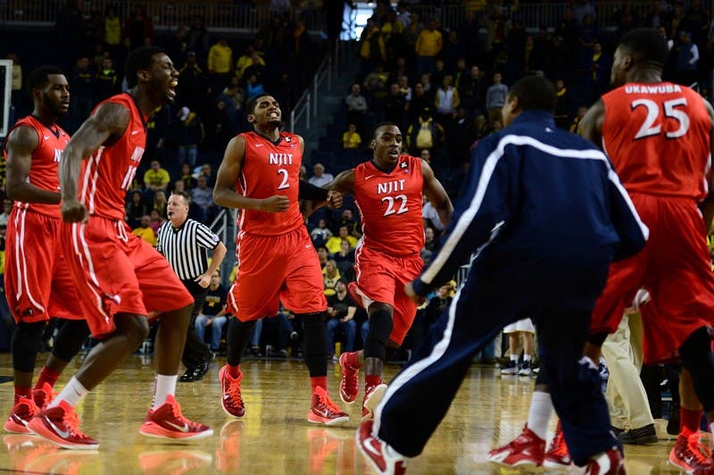 PHOTO CAPTION: NJIT players celebrate incredible win over Michigan in Ann Arbor