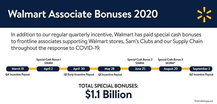 A Walmart spokesperson said the company has given out roughly $1.1 billion in bonuses so far this year, in addition to the regular incentive the company provides to frontline associates on a quarterly basis.