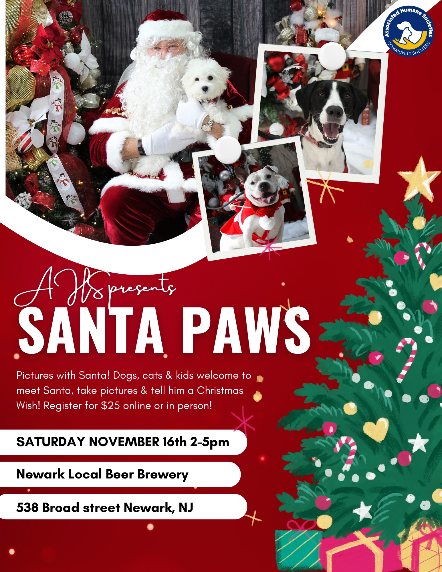 “Santa Paws: Photos with Santa” will benefit the Associated Humane Societies’ animal shelter in Newark. The event will take place from 2 to 5 p.m. on Saturday, Nov. 16 at the Newark Local Beer Brewery, 538 Broad Street.