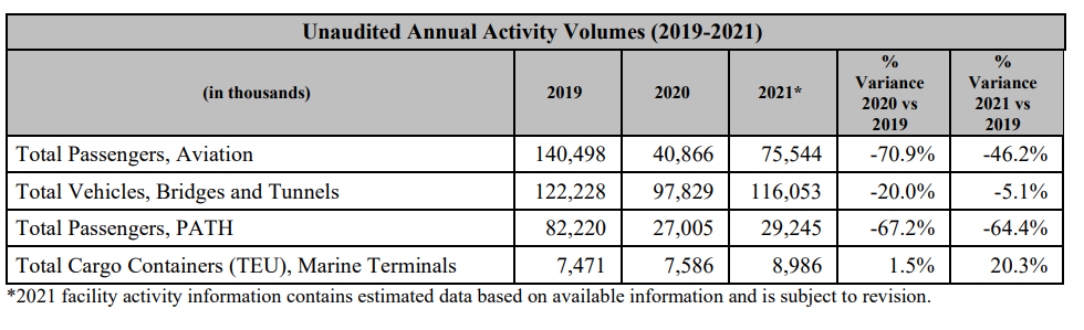 “Weekday activity at the Port Authority’s bridges and tunnels is close to or at 2019 levels and appears headed to achieve pre-COVID-19 pandemic levels on a sustained basis in the coming months … Activity at the Port Authority’s airports is expected to recover closer to pre-COVID-19 levels during 2022, but is forecasted to be approximately 10% below pre-COVID-19 levels across the full year.”