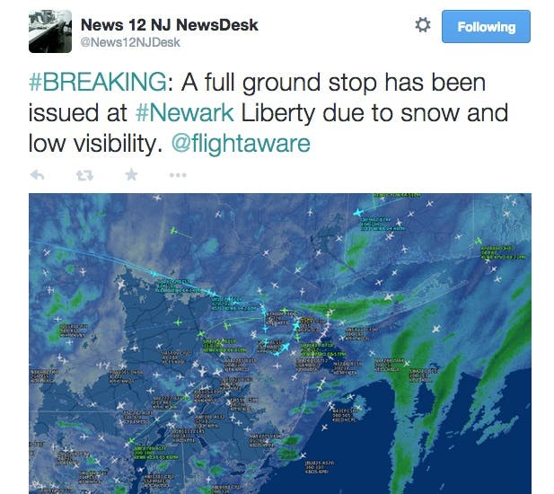 News 12 New Jersey is reporting that Newark Liberty International Airport is at a full ground stop because of the blizzard.