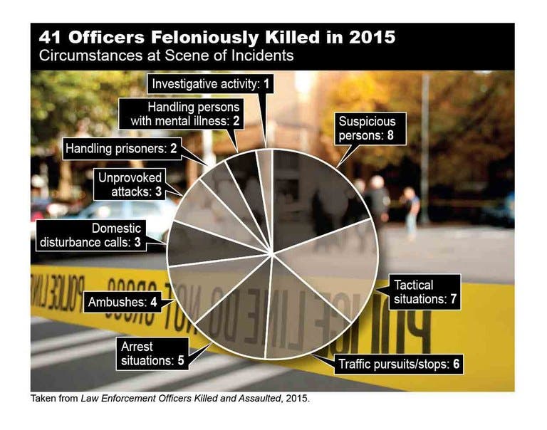 Law enforcement officers in the United States suffered 41 “felonious deaths” in the line of duty during 2015, almost a 20 percent drop from the 51 cop killings the previous year, according to the FBI’s annual Law Enforcement Officers Killed and Assaulted report released Tuesday.