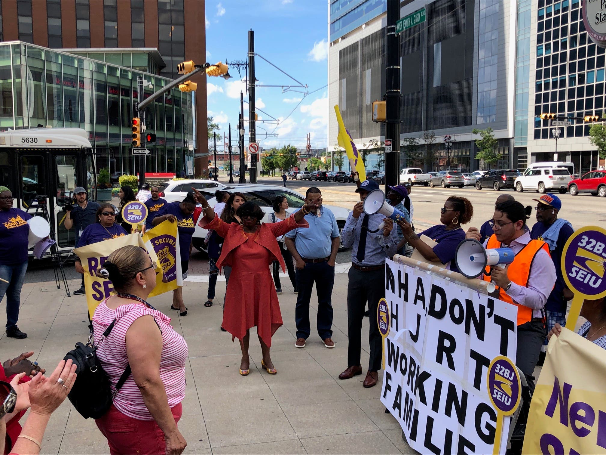 About 50 security officers, cleaners and airport workers with labor union 32BJ SEIU massed Tuesday across the street from the Newark Housing Authority’s office. Attendees at the rally included Newark City Council President Mildred Crump and a representative from the office of Central Ward Council Member LaMonica McIver.