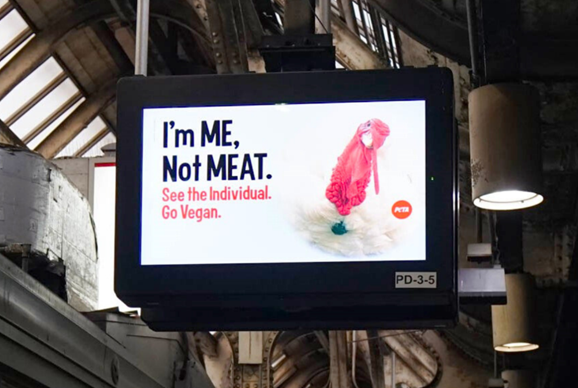 The group is putting up a series of digital messages in the busy train station, which feature chickens, turkeys, cows, pigs and other animals – each of which are making pleas to see animals as fellow beings, not as food.