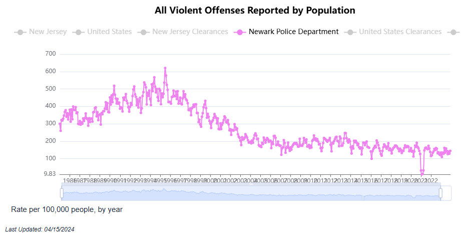 The following graph from the FBI's crime data explorer shows the overall violent crime rate for Newark between January 1985 and December 2023 (article continues below).