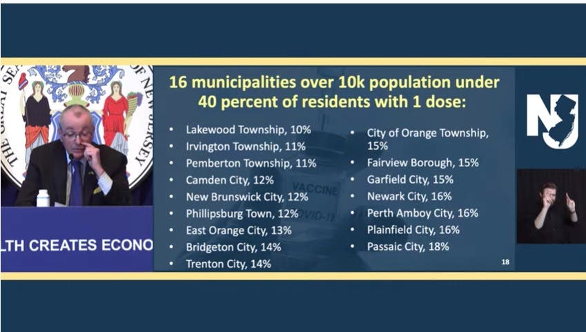 Ninety-three percent of NJ residents return for their second dose, the DOH said. Murphy also called out these towns for low vaccine rates: