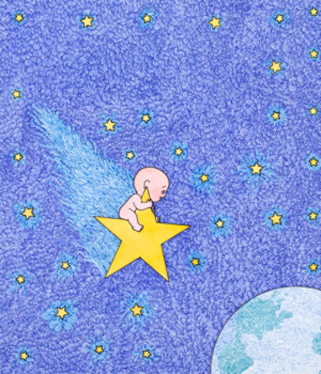 Popcorn and Starbaby, two captivating series of original children’s book illustrations by Frank Asch, are featured in this exhibition. An early Frank Asch “Bear Book,” Popcorn is about Sam Bear hosting an impromptu Halloween party when his parents are out. Starbaby is a delightful bedtime story about a boy who lives in the sky. Asch is a noted author and illustrator of over sixty-five children’s books, poetry, juvenile non-fiction and children’s novels.