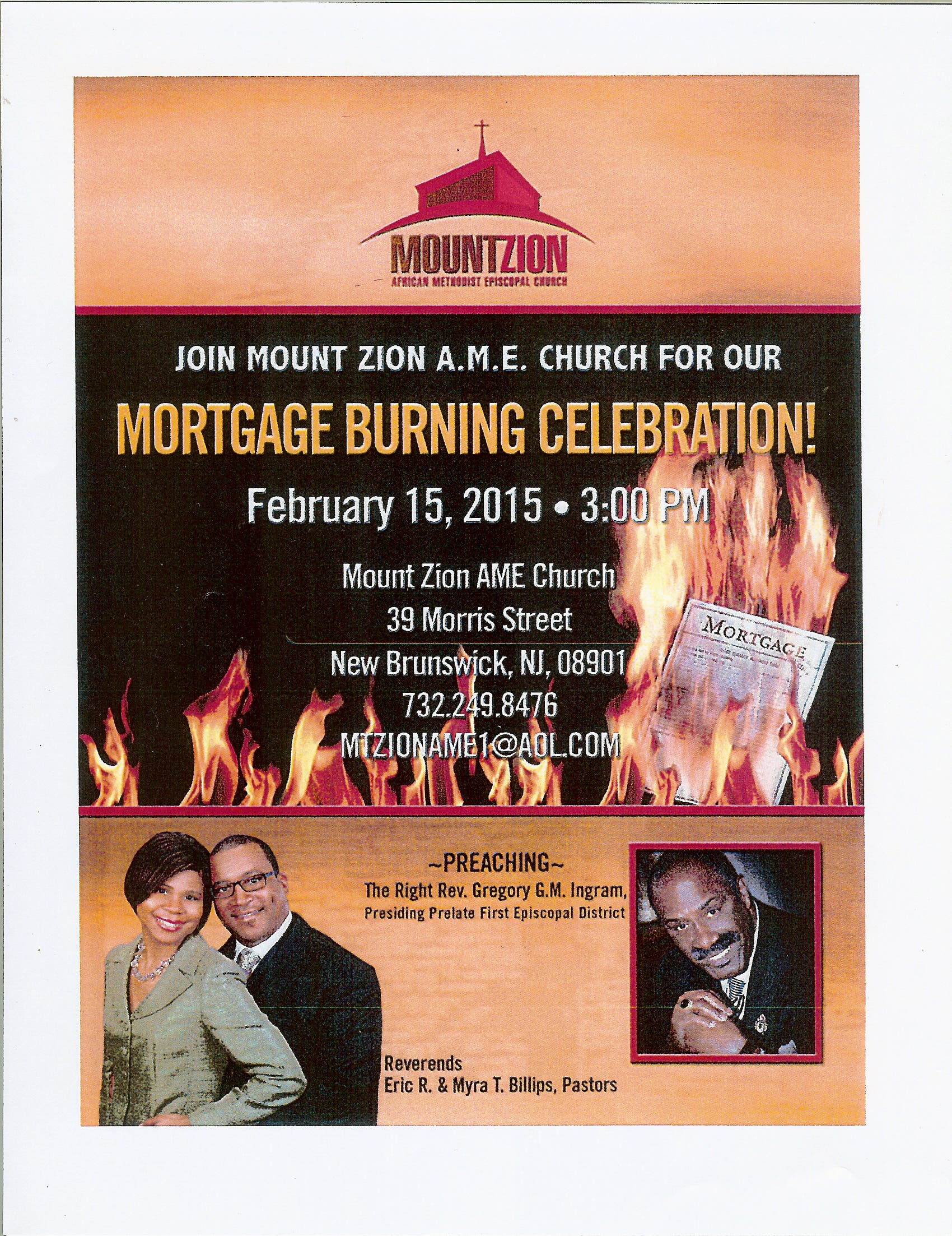 On February 15, 2015, at 3:00 p.m., the congregation of Mt. Zion A.M.E. Church, New Brunswick, New Jersey, led by their pastors, Revs. Eric R. and Myra T. Billips, will hold a special service for the burning of its mortgage. The Presiding Prelate of the First Episcopal District, The Rt. Rev. Gregory G. M. Ingram, will be the preacher for the service.