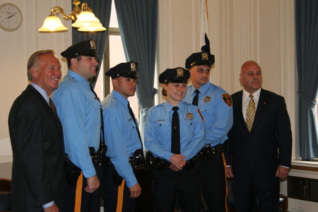 New Brunswick Mayor James M. Cahill, with Police Director Anthony Caputo, swore-in four new New Brunswick Police Officers on May 22.