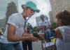 On a bright sunny day, workers on lunch break, children off from school and people buying fresh produce stopped to learn about community wellness services and get their health checked at tables manned by Rutgers at the market at PSE&G Plaza.