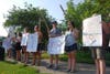 Protesters were waiting for the governor outside the Glenpointe Marriott Wednesday.