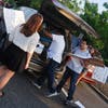 Protesters, who expected to see Christie, gathered outside the hotel with signs criticizing budget cuts and model helicopters mocking the . Christie later repaid the state for the flight.