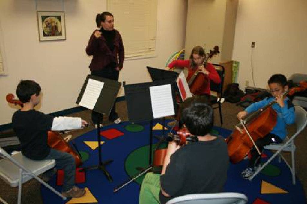 Cellist and WMC faculty member Alice Hamlet directs a cello ensemble.