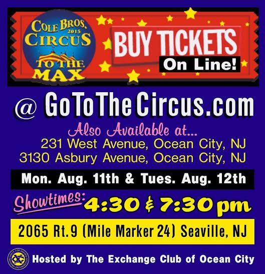 The Exchange Club of Ocean City is hosting Cole Brothers - Circus to the Max on Monday, Aug. 10, and Tuesday, Aug. 11, 4:30 p.m. and 7:30 p.m. each day.
