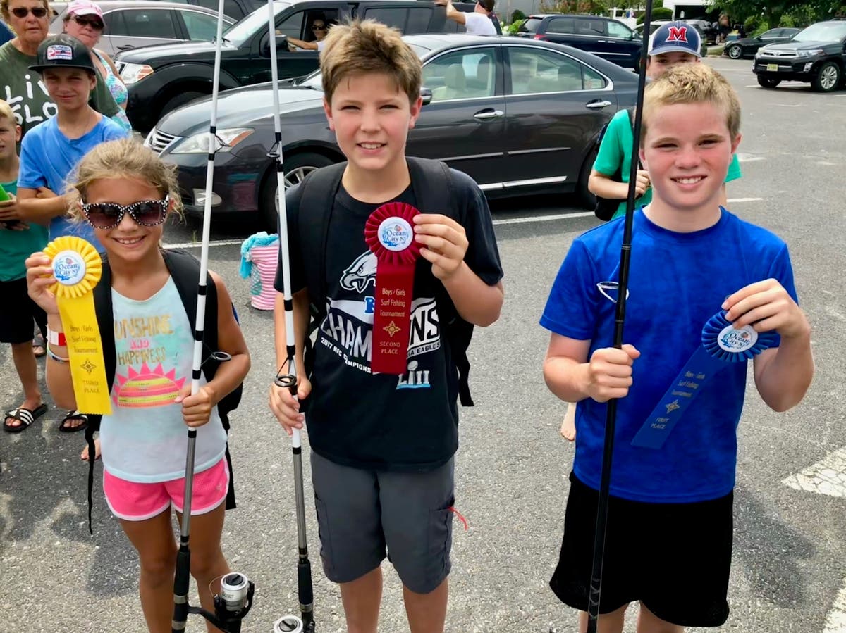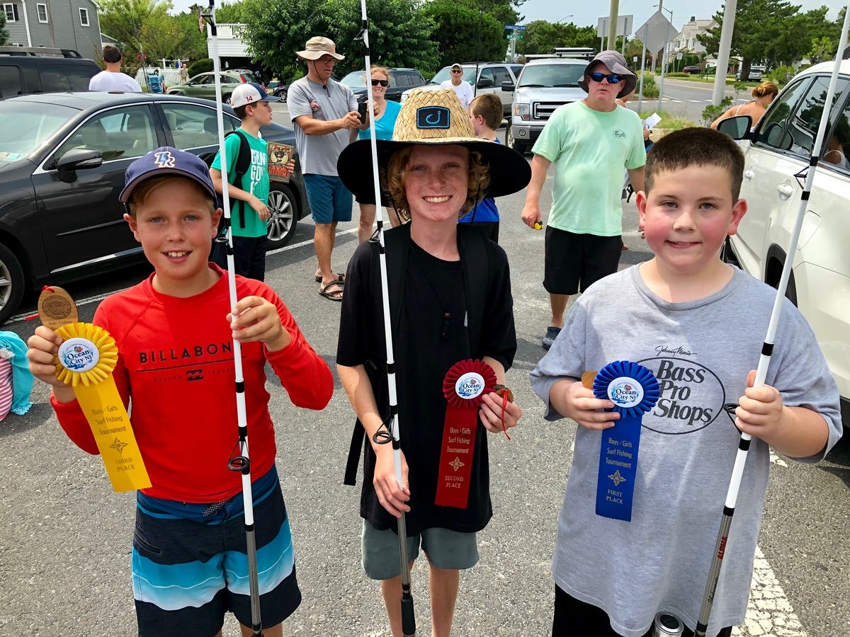 Justin Lowery (right) took top hook for the most fish caught in the 11-13 age group, followed by Finn Seeger (center) and Jack Reiscke in Ocean City Fishing Club's 43rd Annual Boys and Girls Surf Fishing Tournament. Justin also caught the largest fish overall in the boys division landing a 15.5-inch fluke.