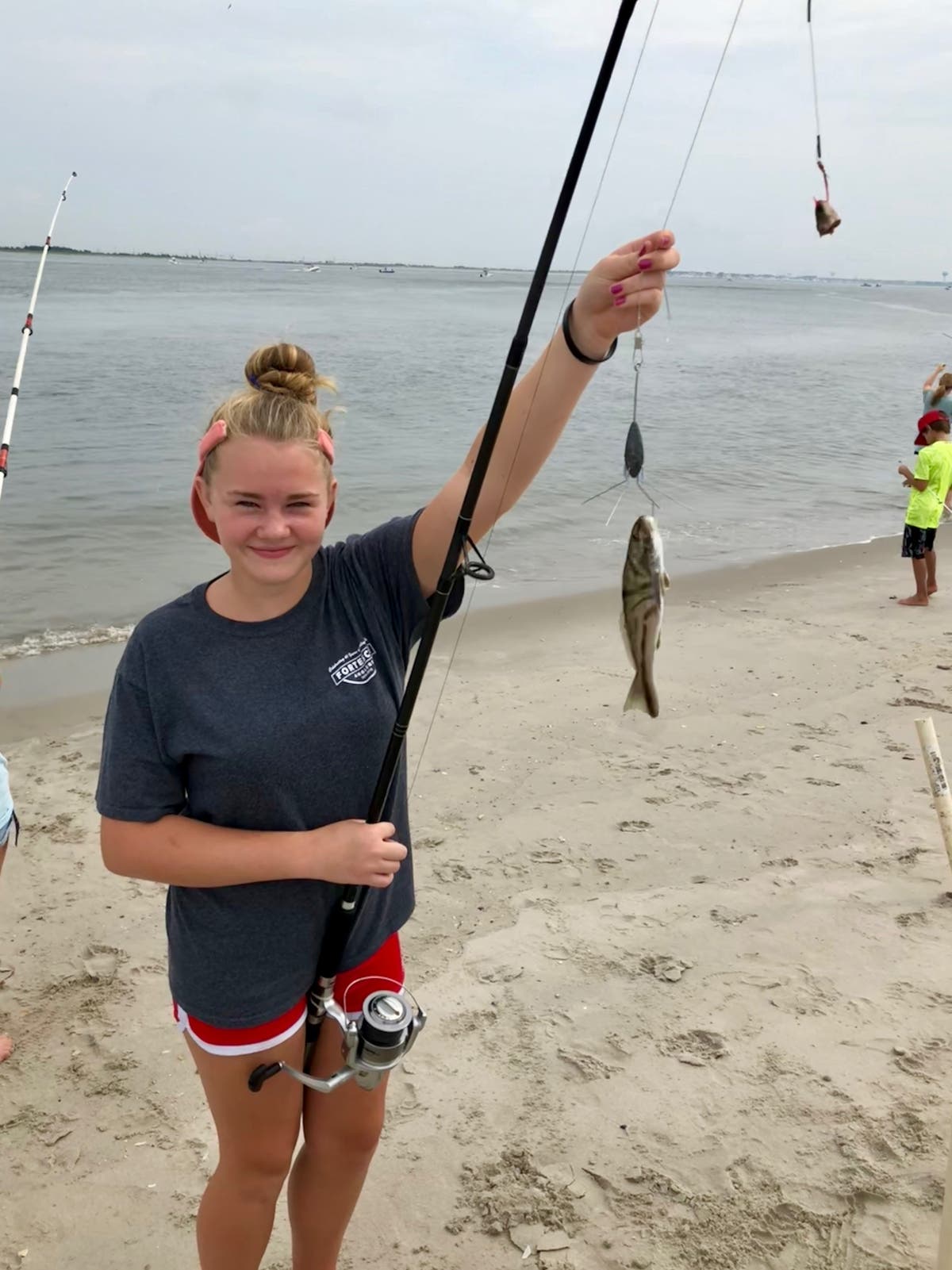 Courtney Stimson, 13, of Monroeville, shows off a kingfish, the first fish caught in the Ocean City Fishing Club's 43rd Annual Boys and Girls Surf Fishing Tournament that was held Saturday.