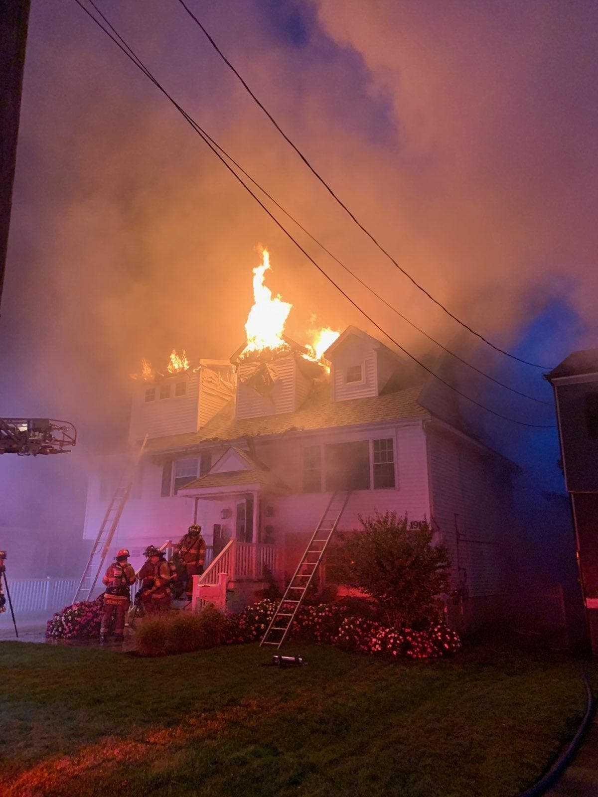 Firefighters reported heavy fire conditions on all floors of the rear side of a two-and-a-half-story home with extension to the attic area, according to the release.