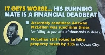 It displays a black and white image of McClellan inside an oval with a circular background. The mailer calls McClellan a "financial deadbeat" and states the following: "Assembly candidate Antwan McLellan (sic) was sued nine times for failing to pay tens of thousands in debts. McLellan (sic) still voted to hike property taxes by 23% in Ocean City."