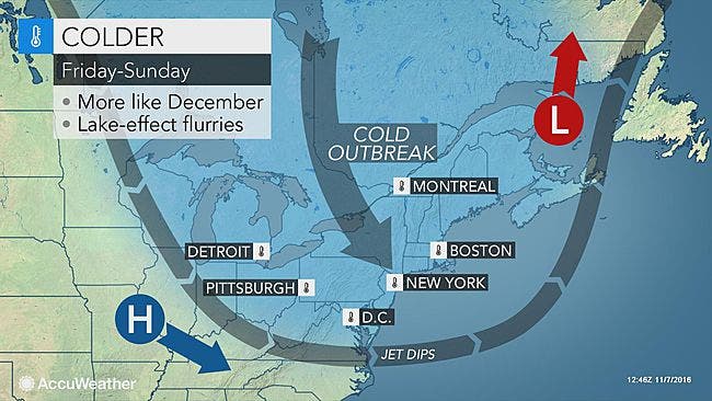 A cold front will dive southward on Friday, causing temperatures behind it to plummet well below normal for the weekend. "A brisk northwest wind will bring an early December-like chill to the Northeast this weekend," AccuWeather Meteorologist Max Vido said in an AccuWeather release.
