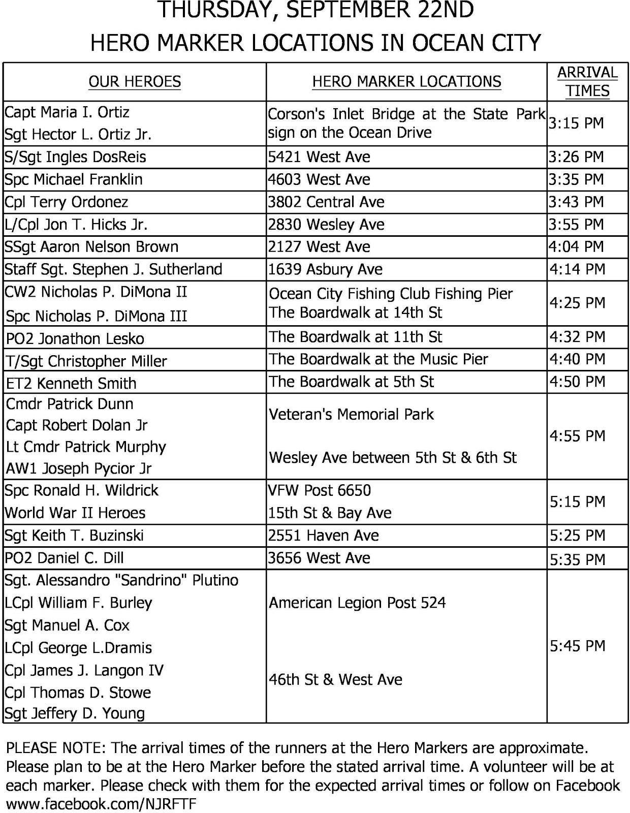 Twenty-eight of those Hero Markers are in Ocean City, at 16 locations. The runner arrival times are listed below. Members of the public are invited to come to the spots 15 minutes prior to the arrival time to show their appreciation.