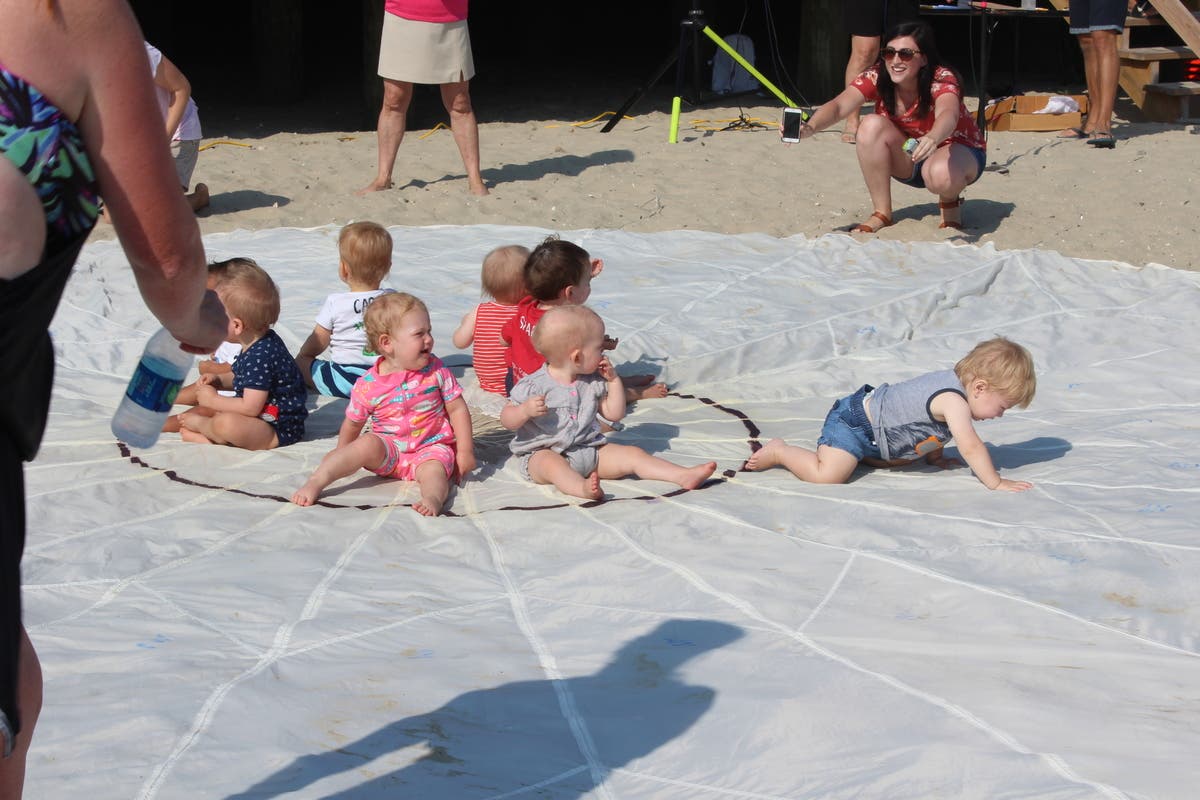 The competitors all start at the center of a parachute, and whoever crawls out to their mother or father the fastest wins. Winners of Tuesday’s competition were as follows:
