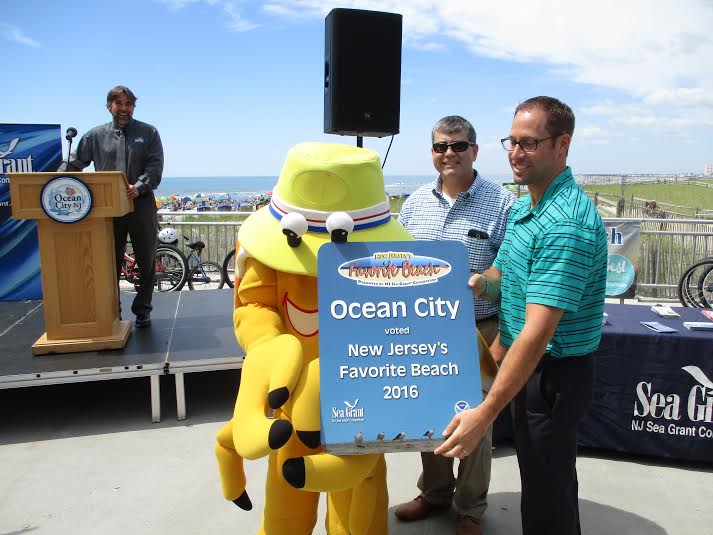 The attached image was provided by Ocean City officials: Ocean City mascot Martin Z. Mollusk, Business Administrator Jim Mallon and City Council Vice President Pete Madden accept the award as New Jersey’s favorite beach.