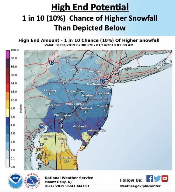 If the storm shifts to the north, as many as 9 inches could fall in in South Jersey, while the rest of the state could get 1 to 5 inches. Read more: New Jersey Snow Totals, Town-By-Town - 1/13/19