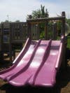 The playground has two wooden structures. The first structure you come across has a long ramp to run up and down, race cars or roll balls. You can also enjoy the trip of purple slides and fun things to climb.