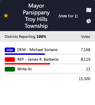 Barberio, a Republican, leads Soriano by about 1,000 votes in Parsippany's mayoral race with all districts reporting. In the Township Council race, Republicans Justin Musella and Frank Neglia hold the advantage against Democratic candidates Cori A. Herbig and Judith Hernandez.