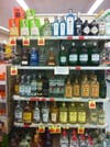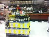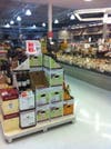 The market has specific aisles where like products are sold together, along with numerous displays where sale items are strategically placed—for example, discounted wines are featured near gourmet cheeses.
