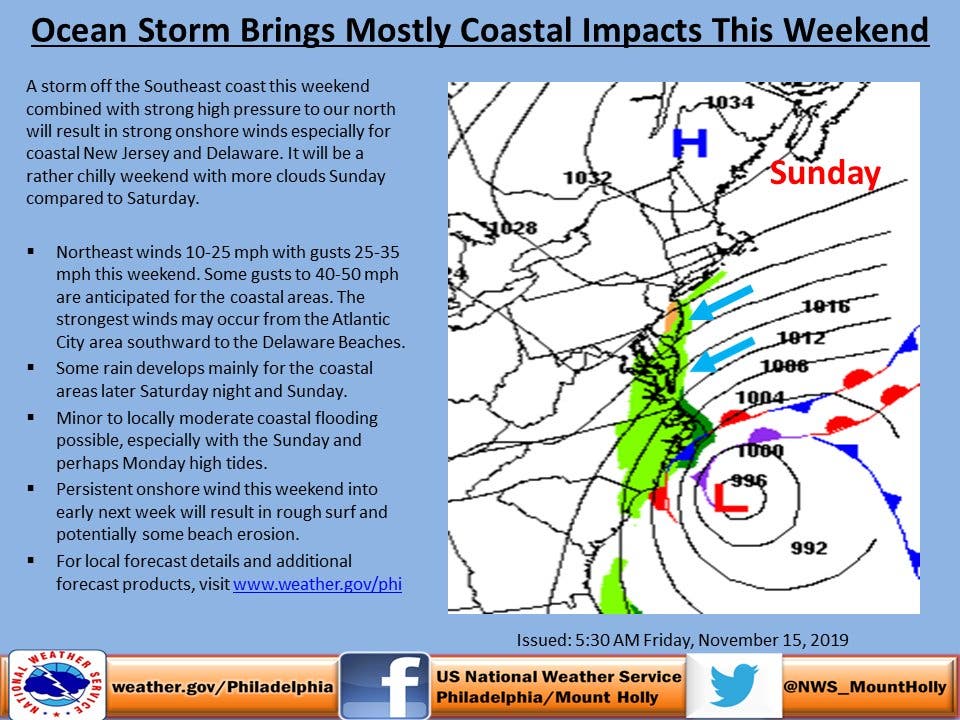 Northeast wind gusts should reach 40 to perhaps 50 mph Saturday and Sunday, especially along the Atlantic coast, with areas from the Atlantic City region southward to the Delaware Beaches potentially receiving the strongest winds. A wind advisory may be needed for at least parts of the area, the NWS says.