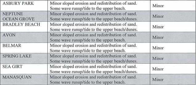 Some of the worst hit areas were in Cape May County, where beaches such as Sea Isle City had 50 feet of erosion. Monmouth County was also especially hard hit, where towns like Sea Bright and Parts of Long Branch had 25 feet of erosion. Long Beach Island lost 40 feet.