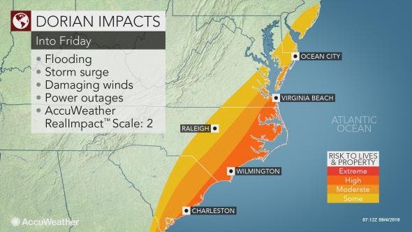 Meanwhile, Hurricane Dorian continues to batter Florida after having devastating impacts on the Bahamas. The storm is predicted to "make a prolonged crawl near or offshore from the East Coast" as the week progresses. By Friday night, the center of Dorian will move into the Atlantic Ocean.