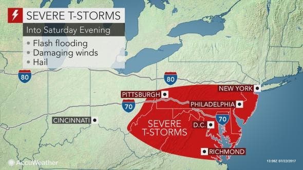 The pattern for severe thunderstorm activity and heavy rainfall the past few days will energize and increase the risk to lives and property across the northeastern United States this weekend, according to AccuWeather.