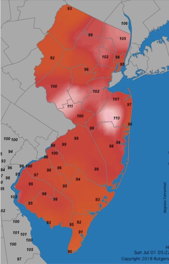 Parts of Mercer County and Monmouth County reached a 110- to 111-degree heat index on Sunday, and we have the locations. Parts of Camden County hit 106 already on Monday.