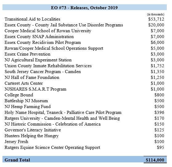 “I am pleased that we are able to release a significant portion of the funding that had been placed into reserve this summer,” said Treasurer Elizabeth Maher Muoio. “We will continue to closely monitor revenue collections and additional savings initiatives booked in the budget and hope to be able to release additional funds as expeditiously as possible.