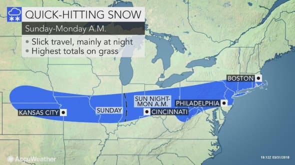 Slippery travel and snow-covered roadways will again become an issue from the Ohio Valley to the mid-Atlantic, where most of the snow should fall on Sunday night. Motorists will not be the only ones impacted, according to AccuWeather. Flights in and out of Indianapolis; Pittsburgh, Harrisburg, Allentown and Philadelphia, Pennsylvania, could face delays and cancellations Sunday evening through Monday morning.