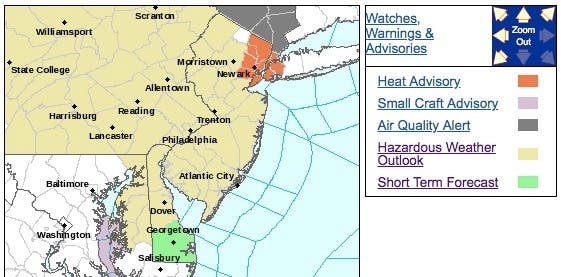 A heat advisory is in effect, too, for parts of New Jersey. The heat index is supposed to hit the upper 90s with actual temperatures in the lower 80s. The worst of it is expected to happen on Monday afternoon and Tuesday afternoon.