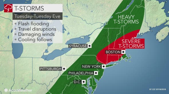 While flash flooding will be the primary threat, strong to in some cases damaging winds will be an additional danger with the storms. The greatest risk for severe weather is forecast to extent from southeastern New York and northern New Jersey to southern parts of New Hampshire, Vermont and Maine, according to AccuWeather.