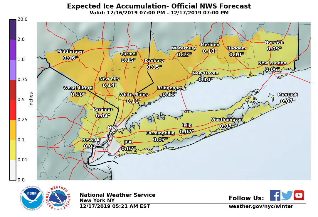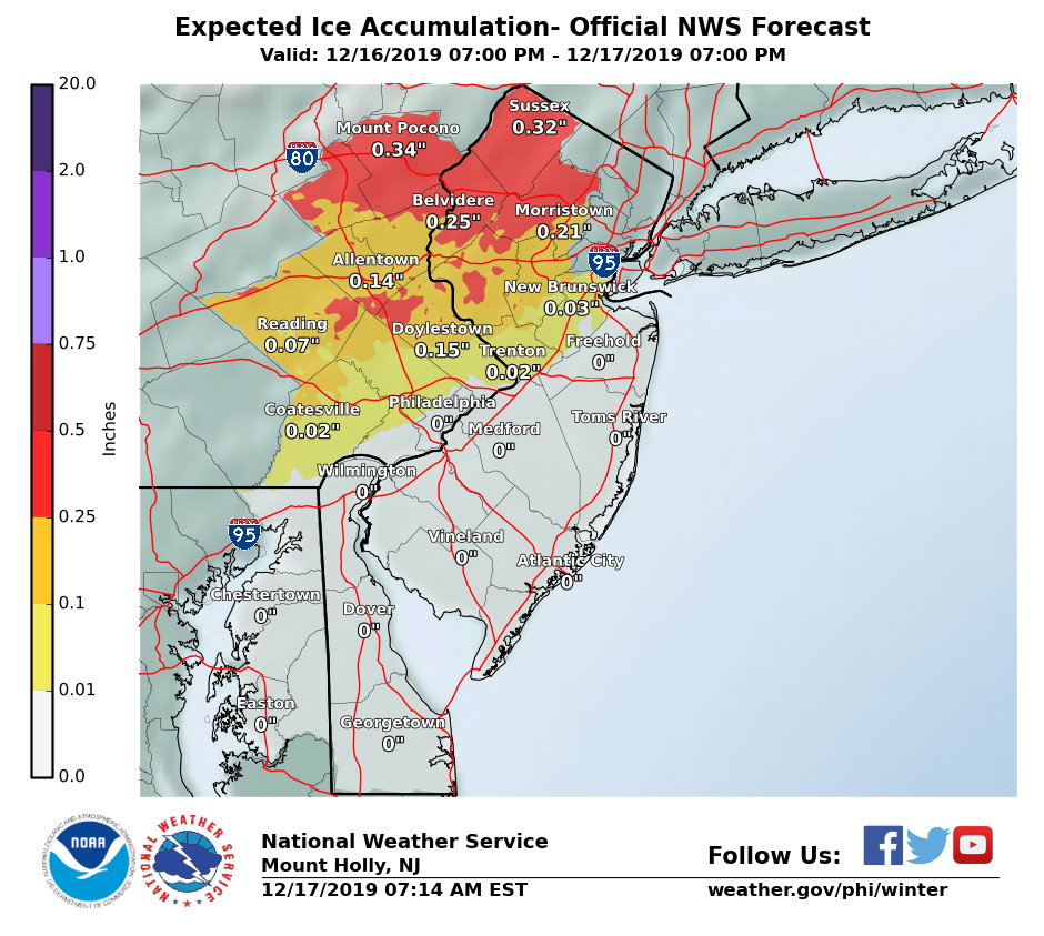 - Freezing rain, mixed at times with sleet, are forecast in Sussex and Warren counties. Additional ice accumulations of two-tenths to four-tenths of an inch are possible.